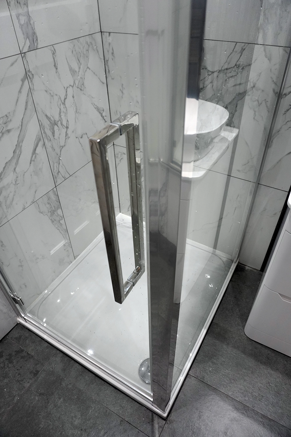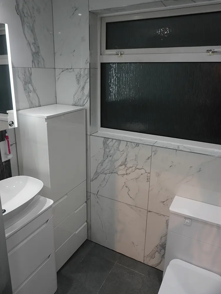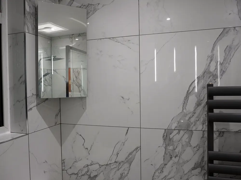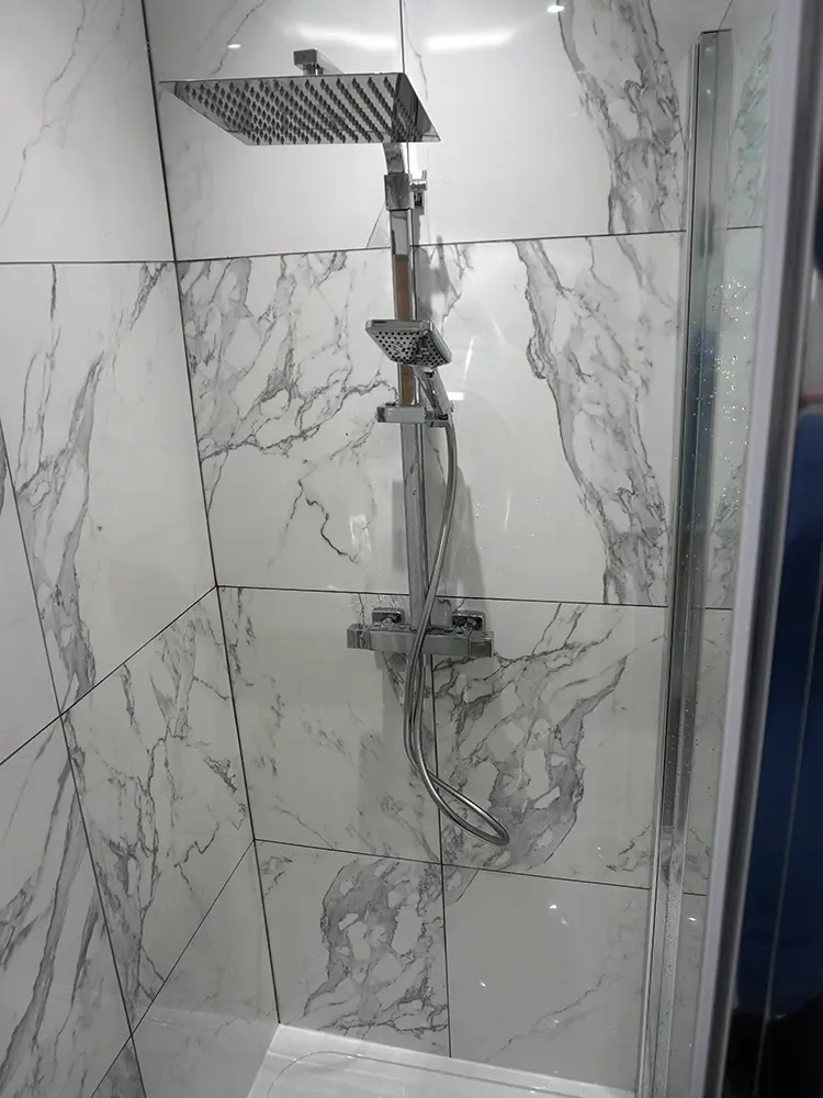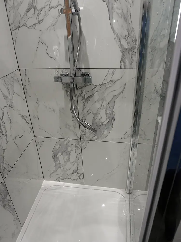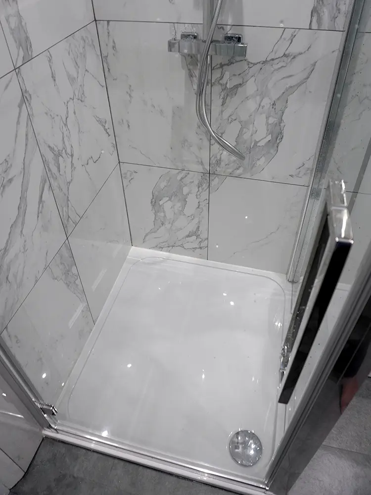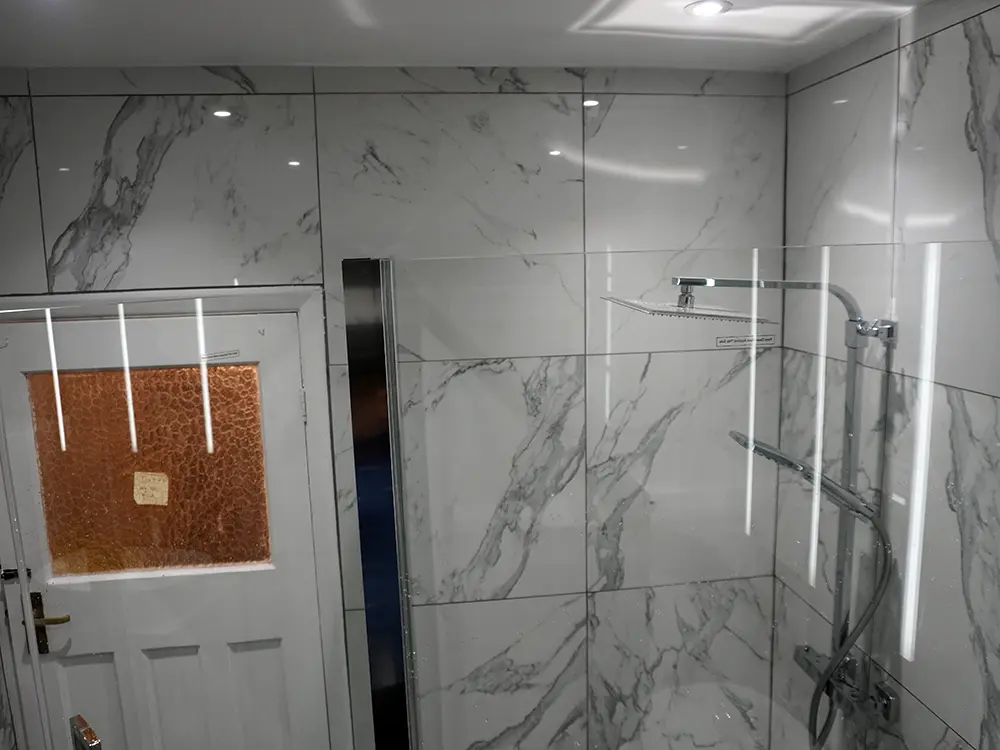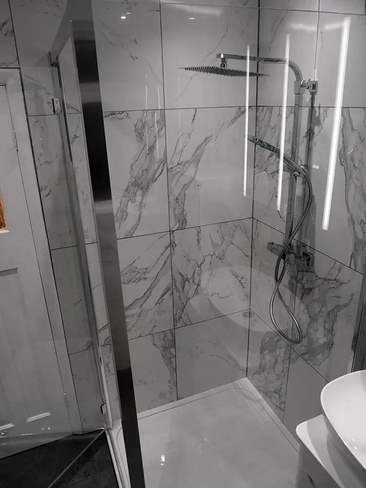 A bath-to-walk-in shower conversion in EN6, involving a full strip-out, reconfigured plumbing and electrics, waterproofing, tiling, and installation of modern sanitaryware for a clean, accessible finish.