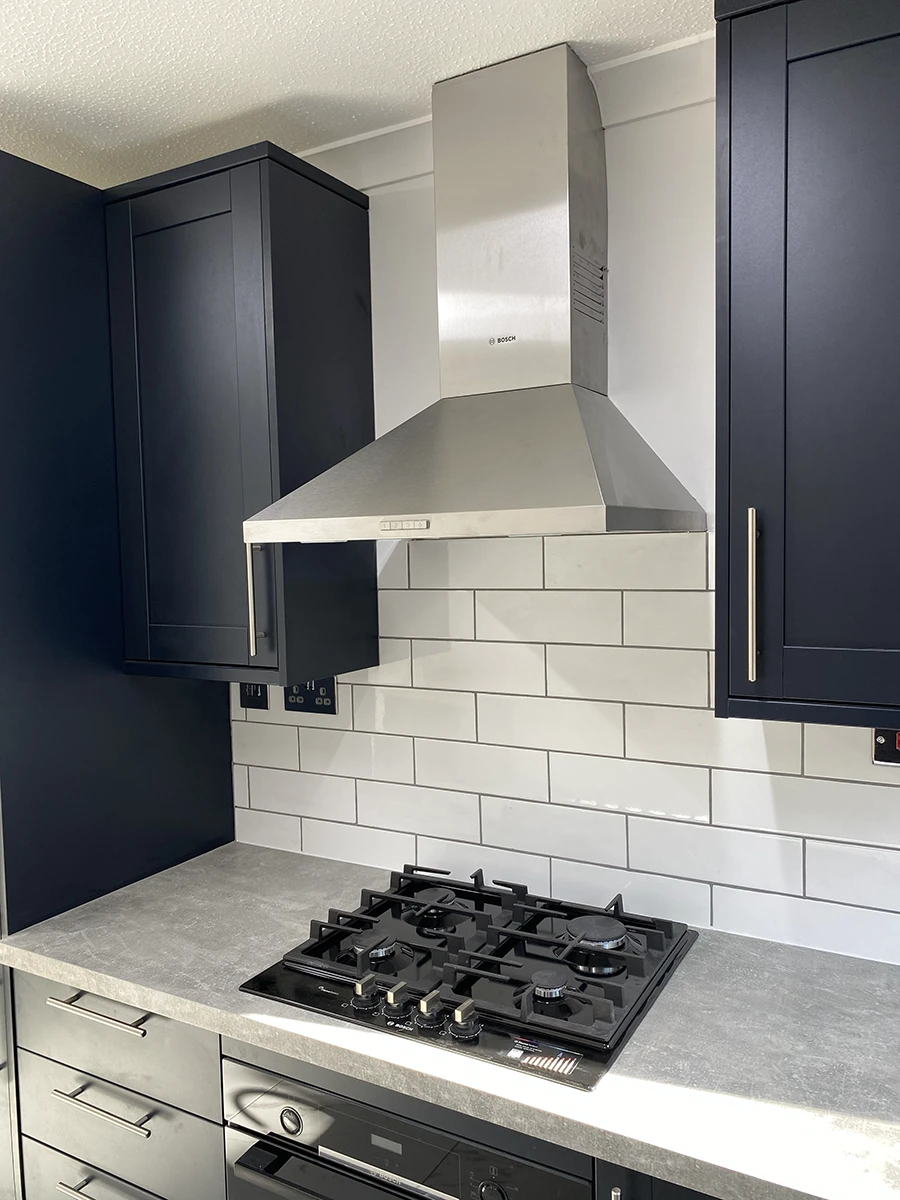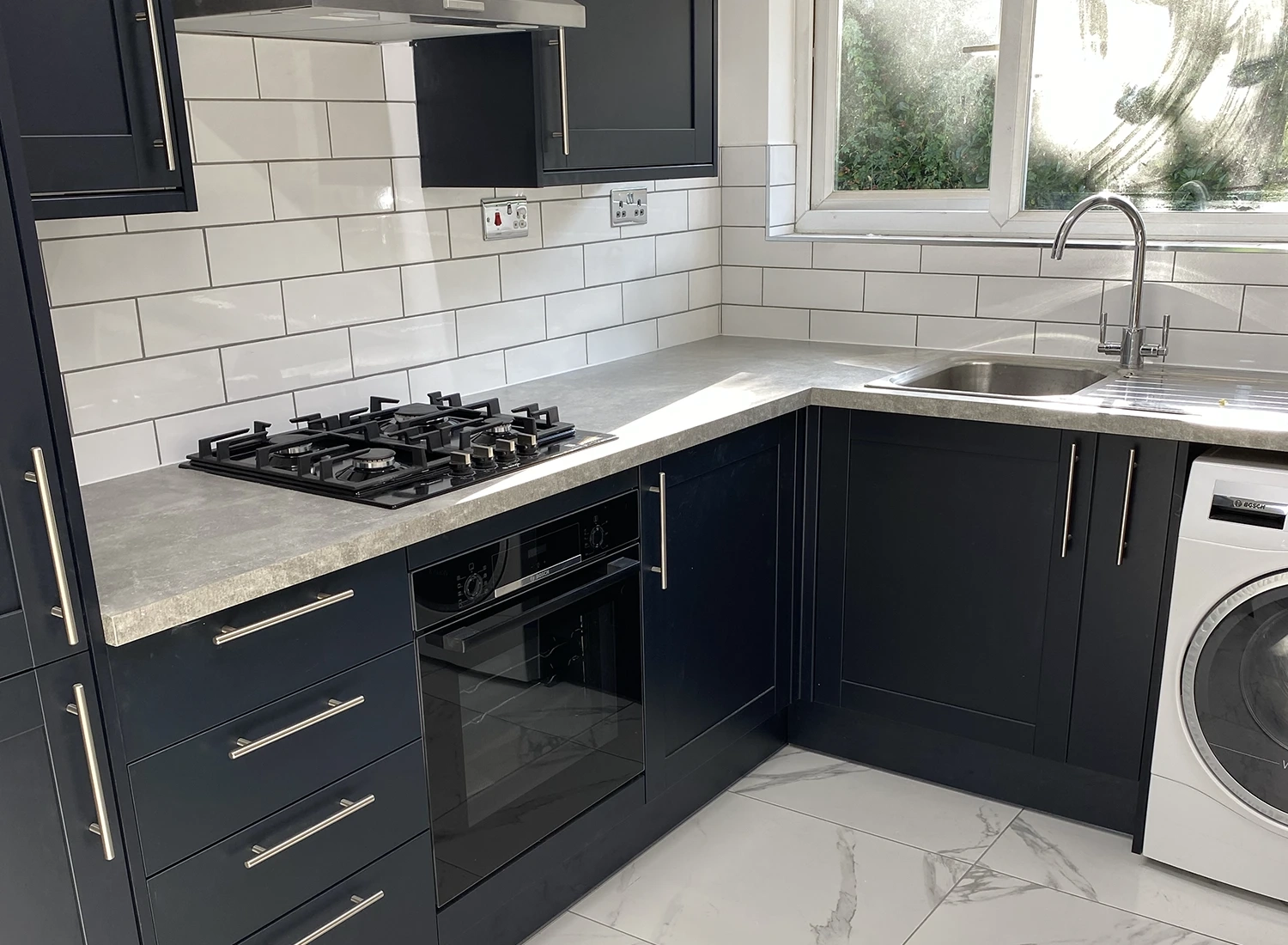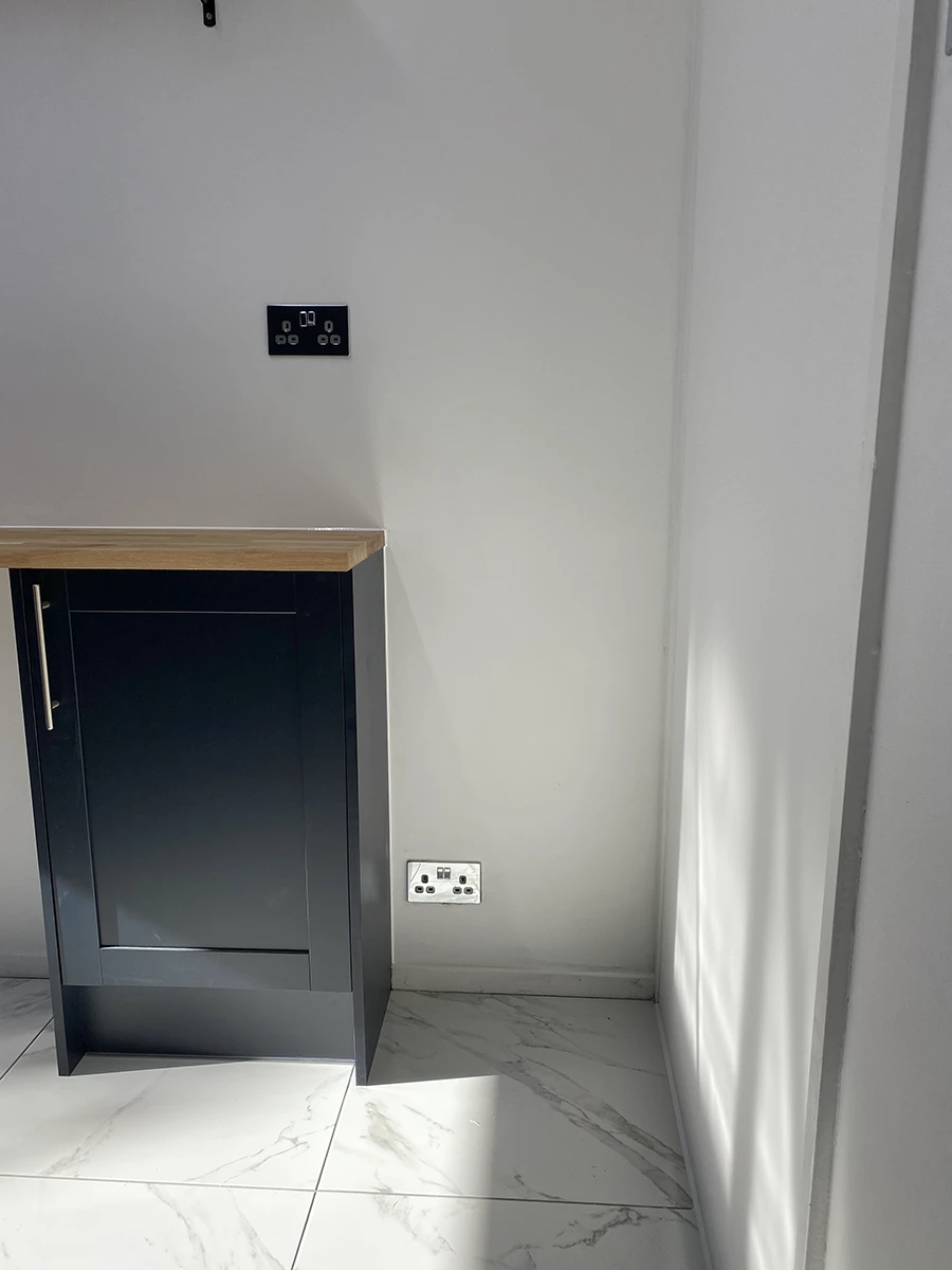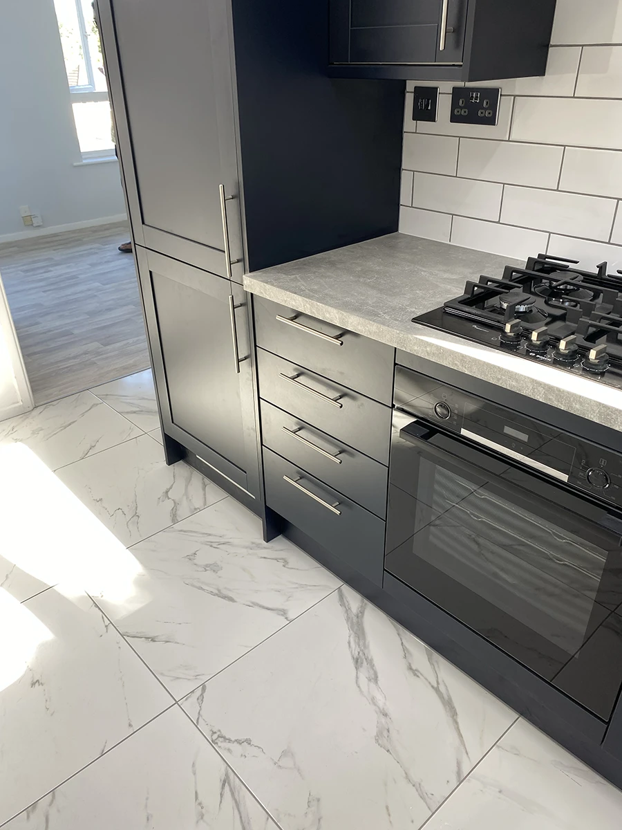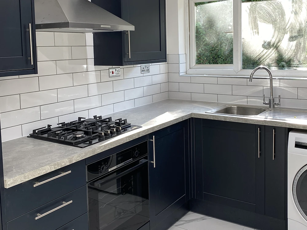The kitchen had no existing gas supply, so a new pipe route had to be formed and chased in without compromising surrounding finishes. Electrical points were limited and needed increasing, with walls opened up and made good to a safe standard. Tiling also needed careful sequencing, as the splashback could only start once units and worktops were fully installed.