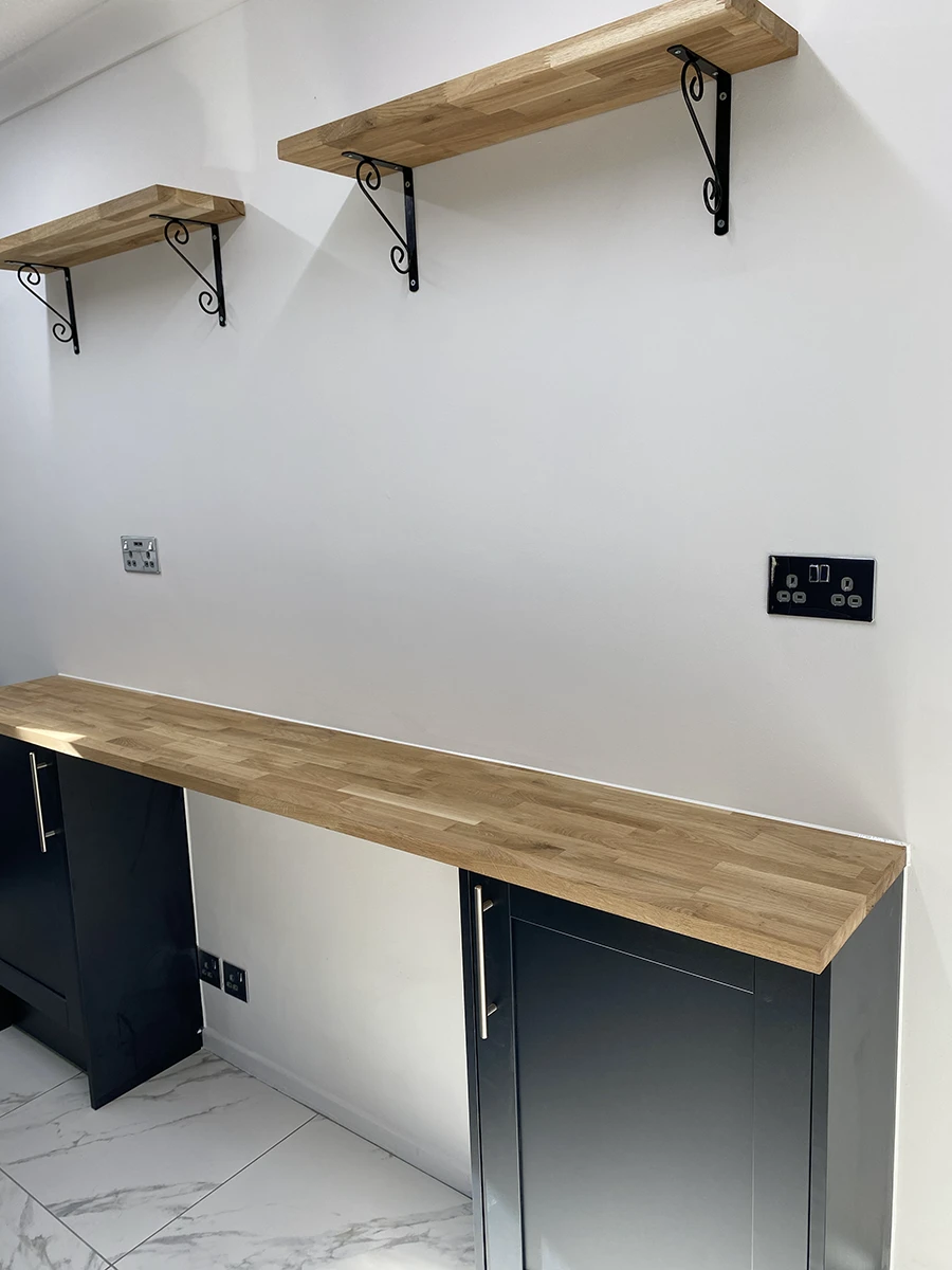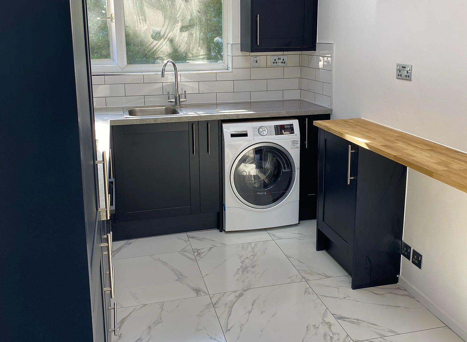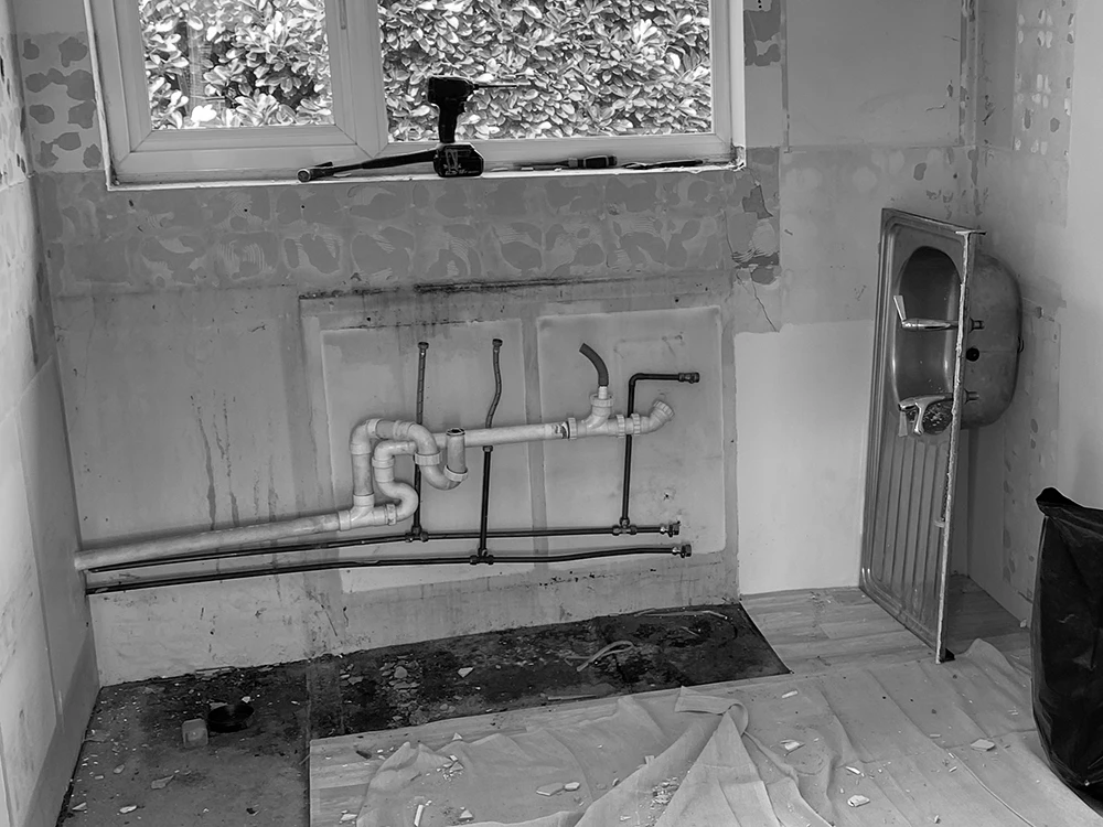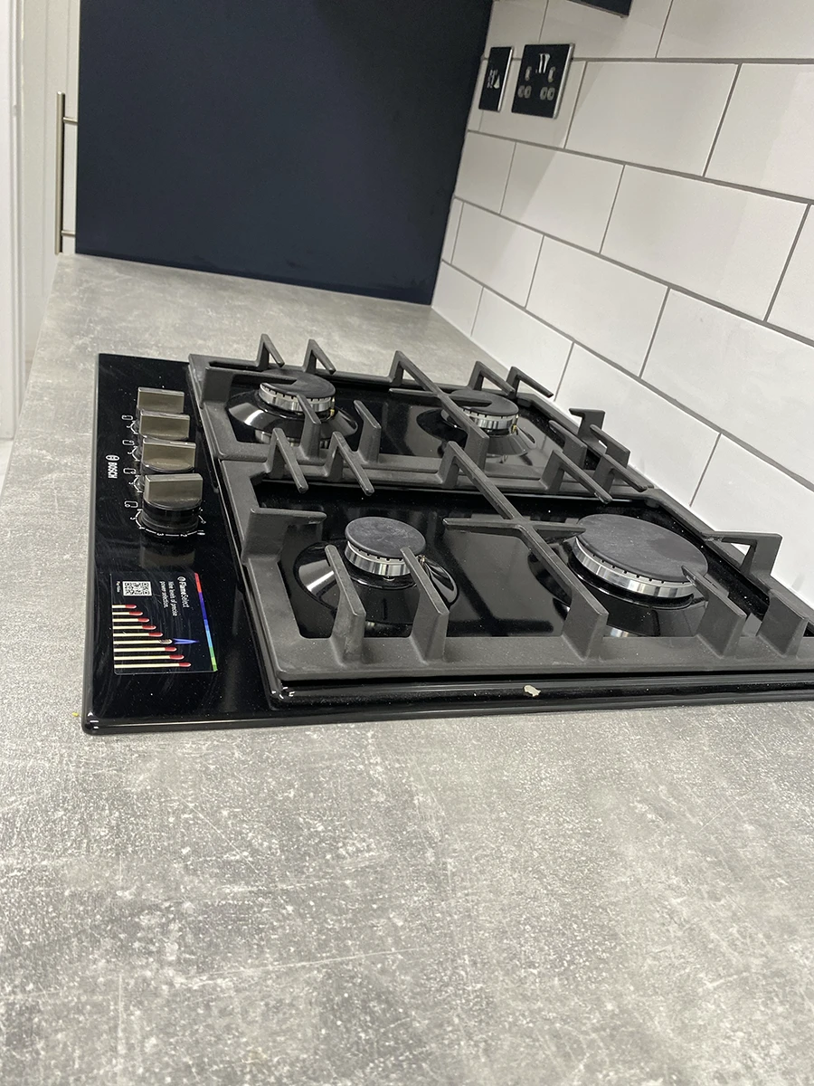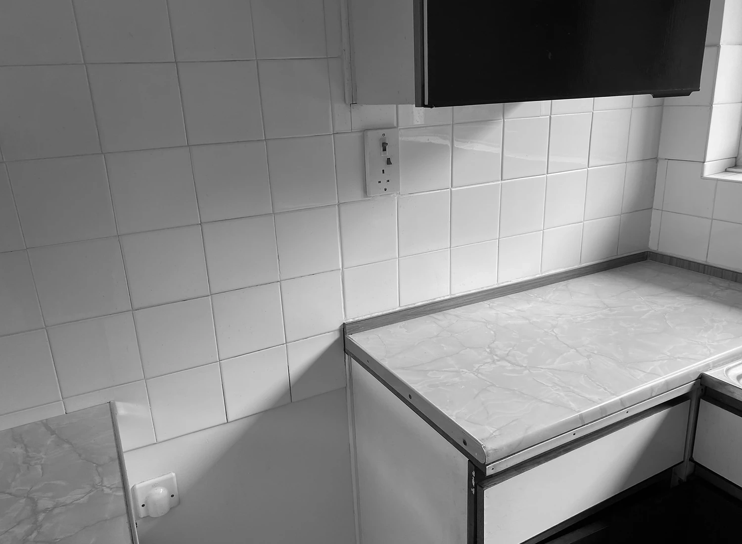 The kitchen had no existing gas supply, so a new pipe route had to be formed and chased in without compromising surrounding finishes. Electrical points were limited and needed increasing, with walls opened up and made good to a safe standard. Tiling also needed careful sequencing, as the splashback could only start once units and worktops were fully installed.