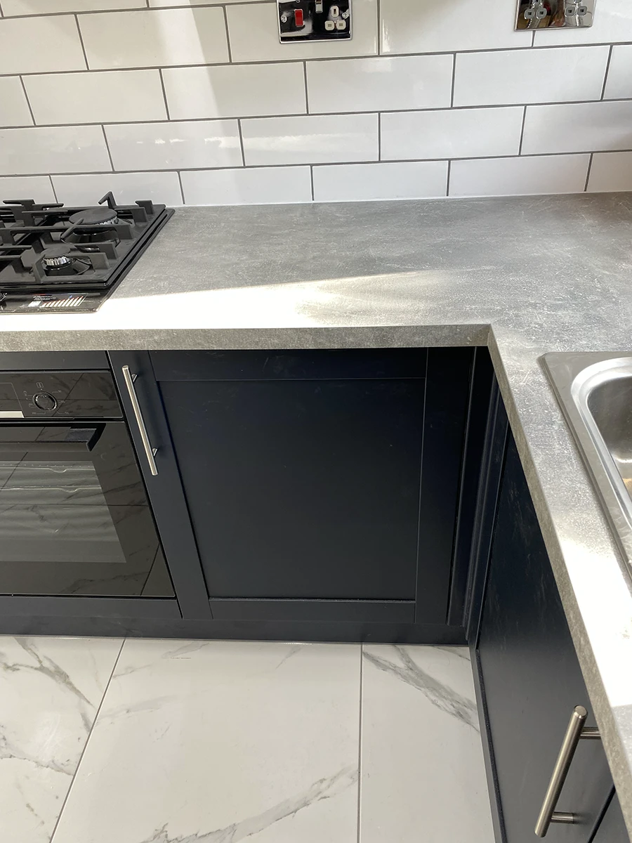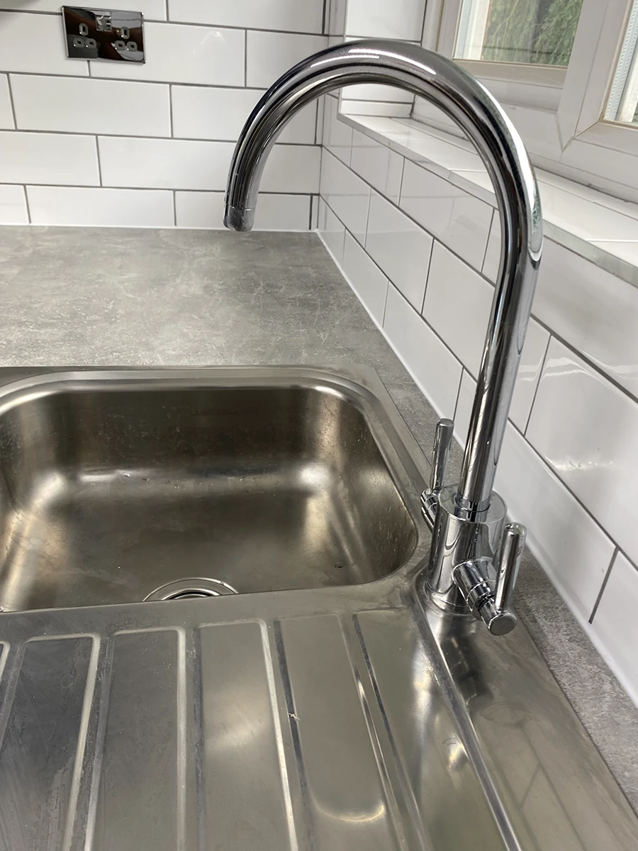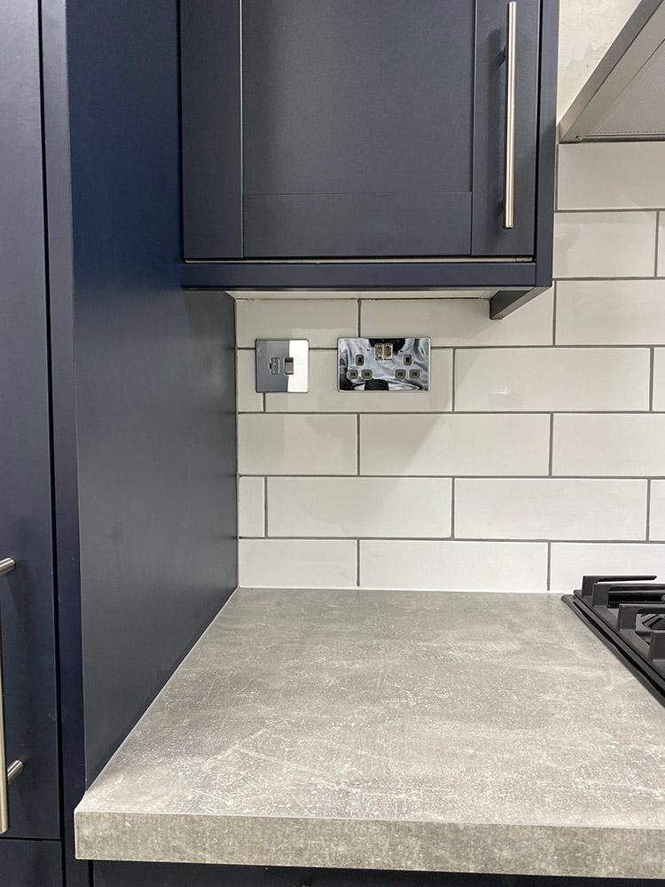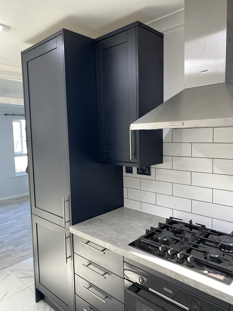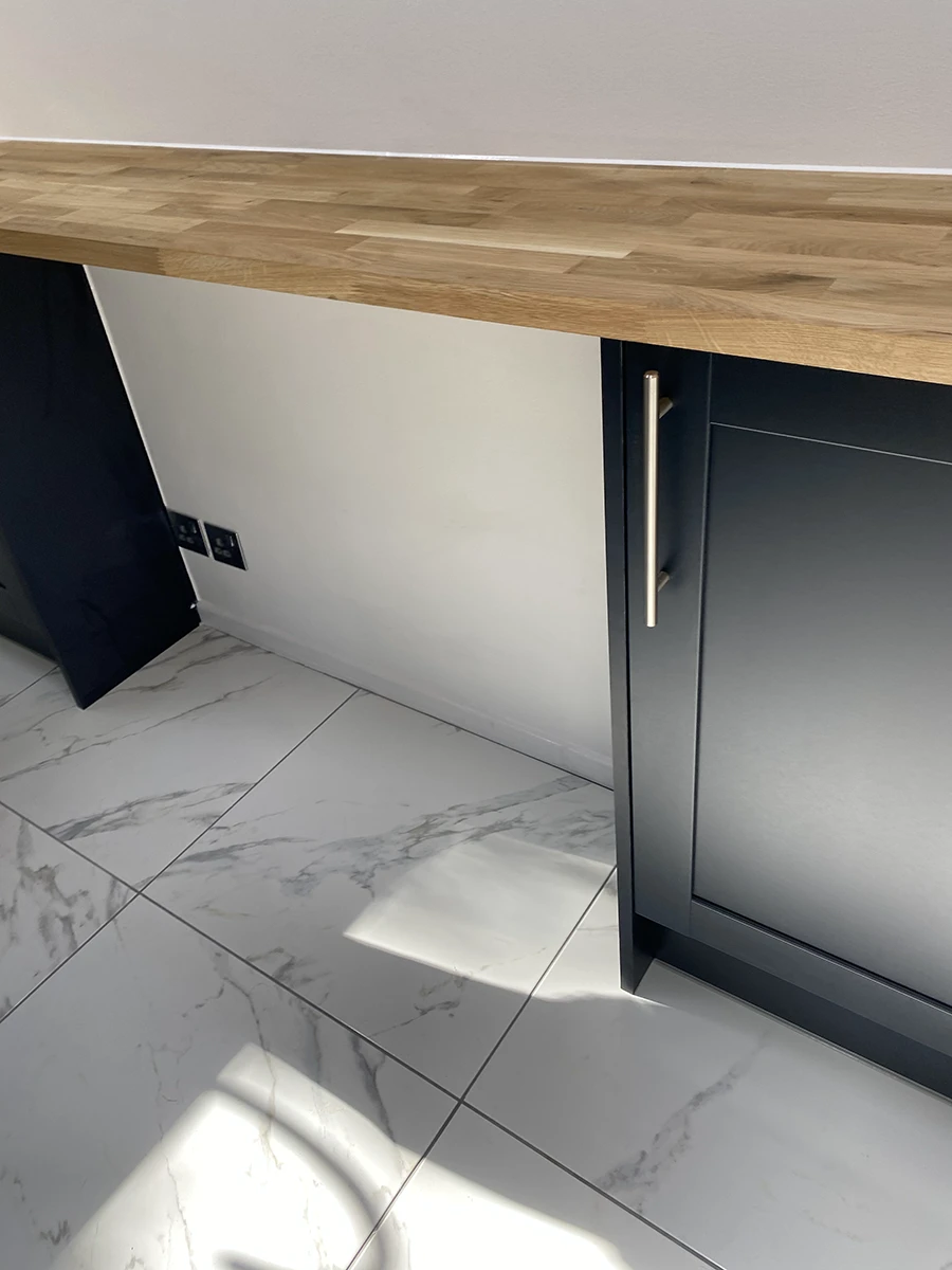 The kitchen had no existing gas supply, so a new pipe route had to be formed and chased in without compromising surrounding finishes. Electrical points were limited and needed increasing, with walls opened up and made good to a safe standard. Tiling also needed careful sequencing, as the splashback could only start once units and worktops were fully installed.