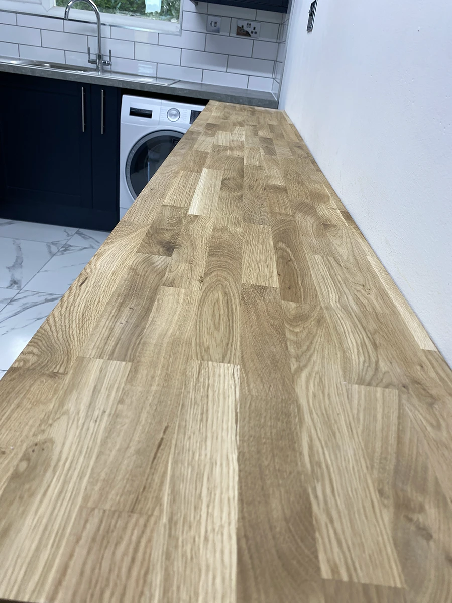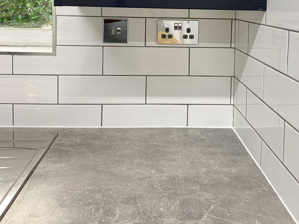We fitted the new kitchen, installed a laminate worktop, and formed the breakfast bar using the agreed excess worktop for consistent edges. The challenge was holding tolerances through corners and junctions so the splashback could be tiled only after the worktops were final. We then bonded and tiled the splashback with ceramic brick tiles and white grout for a clean, durable finish.