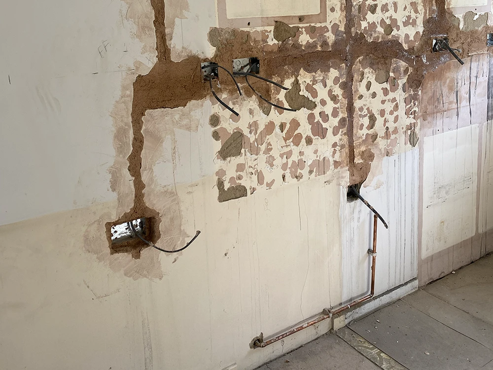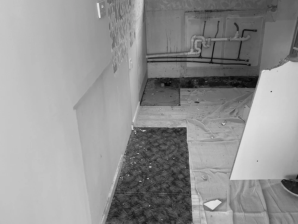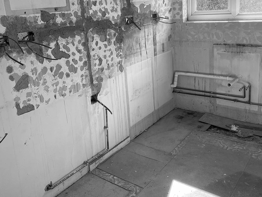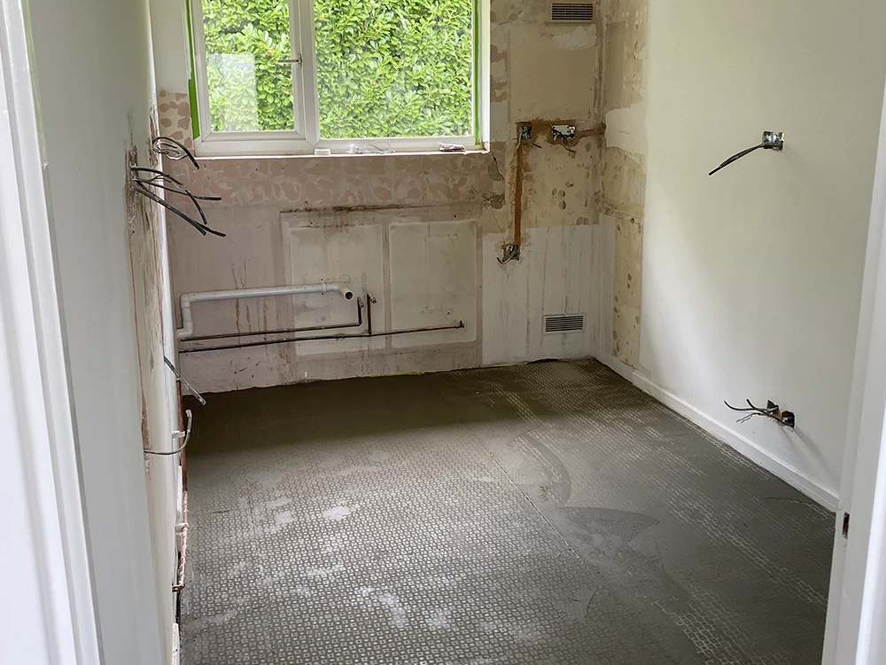 We removed the existing units, worktops, appliances and wall tiles. The constraint was managing waste and access on a live property, including skip placement on a private area and separating items that can’t go into a skip (such as appliances). This left a clean, controlled shell with safe working conditions, ready for accurate setting-out and the service chases needed for the new layout.
